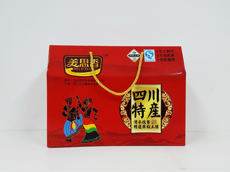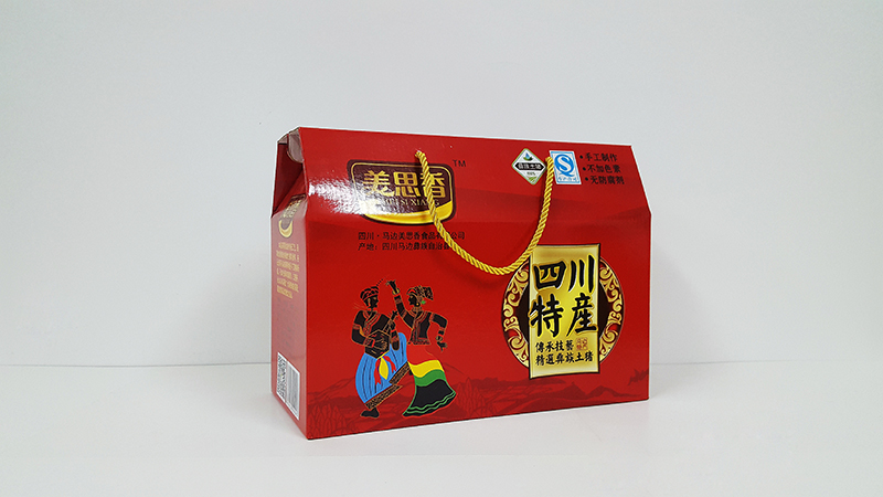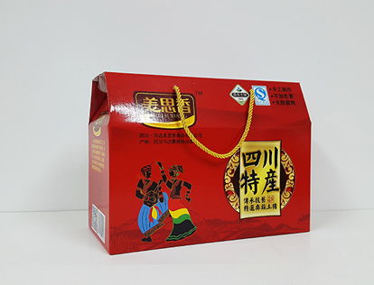 四川土特产礼品盒1、材质:300克灰纸裱E瓦楞;2、工艺:印刷、亮膜